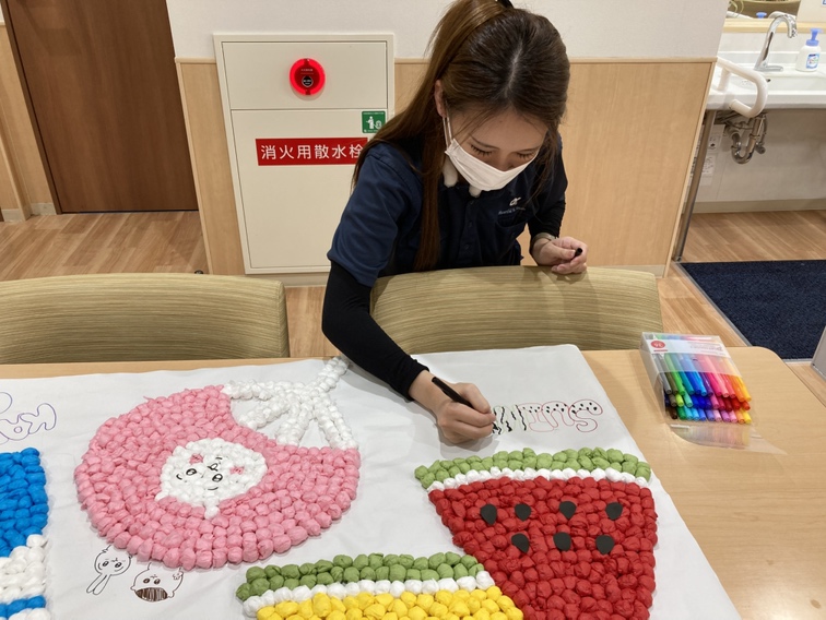 スタッフ同士で協力しながらレクリエーションで使用する物品や、飾りつけなどを手作りで作成しています。