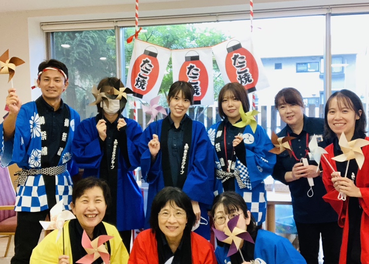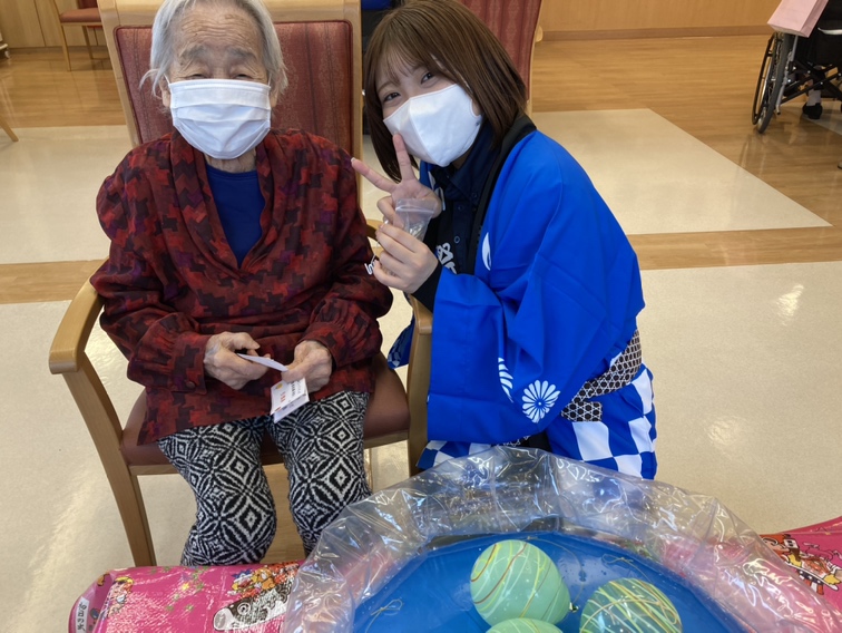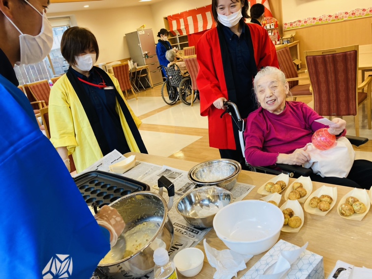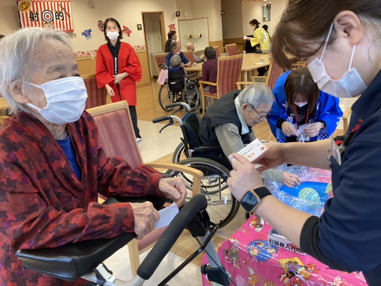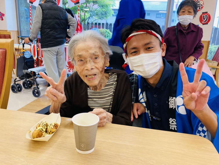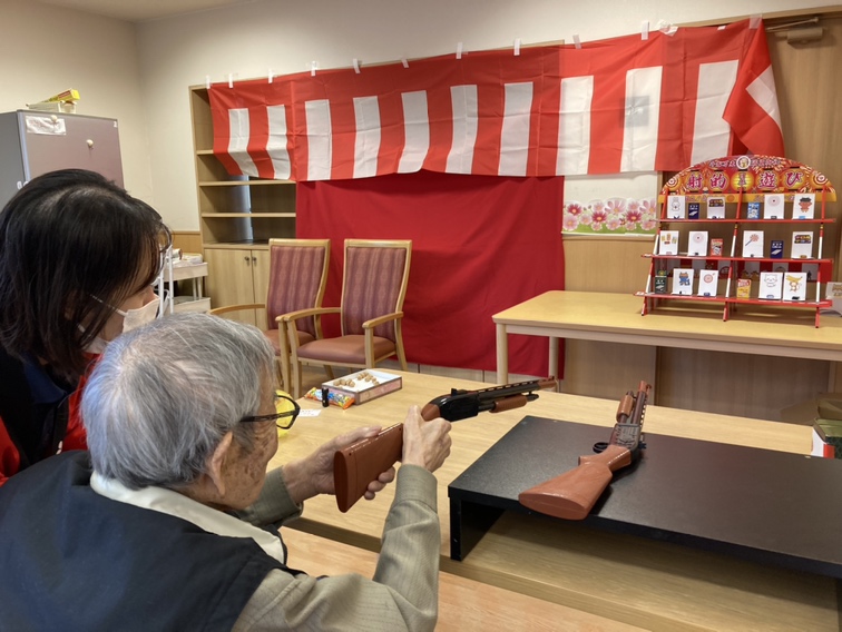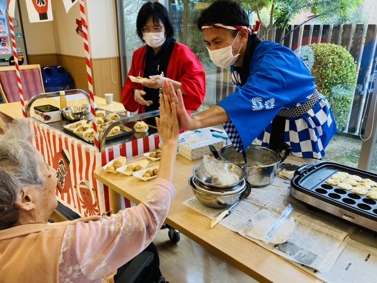 迎えた当日、あなぶきケアサービスの皆さまにも協力いただきながら、レストランが祭り会場に早変わり! 「ヨーヨー釣り、取れたよ!」「射的、一発で命中!」「このたこ焼き、すごく美味しい!」といった声が飛び交い、スタッフも金を鳴らして「おめでとうございまーす!」と盛り上げました。