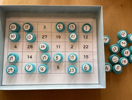 数字が貼ってあるキャップを同じ数字のところに置きます。数字はバラバラの場所にありますので、同じ数字を探すのが大変!!!