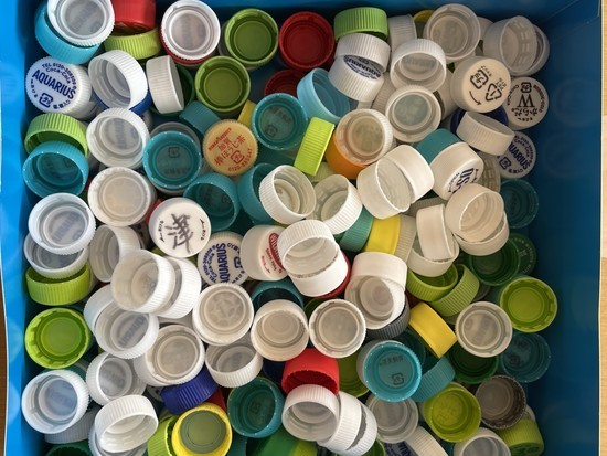 ペットボトルのキャップを再利用して認知機能訓練の道具を作成することになり、ご入居者やスタッフに協力依頼!こんなにキャップが集まりました。