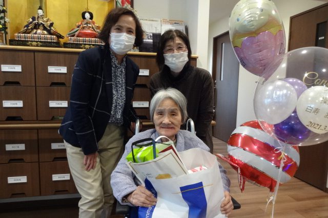 お祝いされたKさまは背筋を伸ばされ、満面の笑顔で「皆さん、お祝いしていただきありがとうございます」と挨拶をされ、嬉しさからか時折涙ぐまれる場面も見られました。