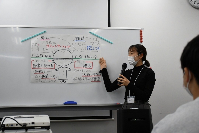 同期の社員に自分の目標を共有することで、共感を得たり、他者の良いところを自分に置きかえて参考にしたりと大変有意義な研修となりました。