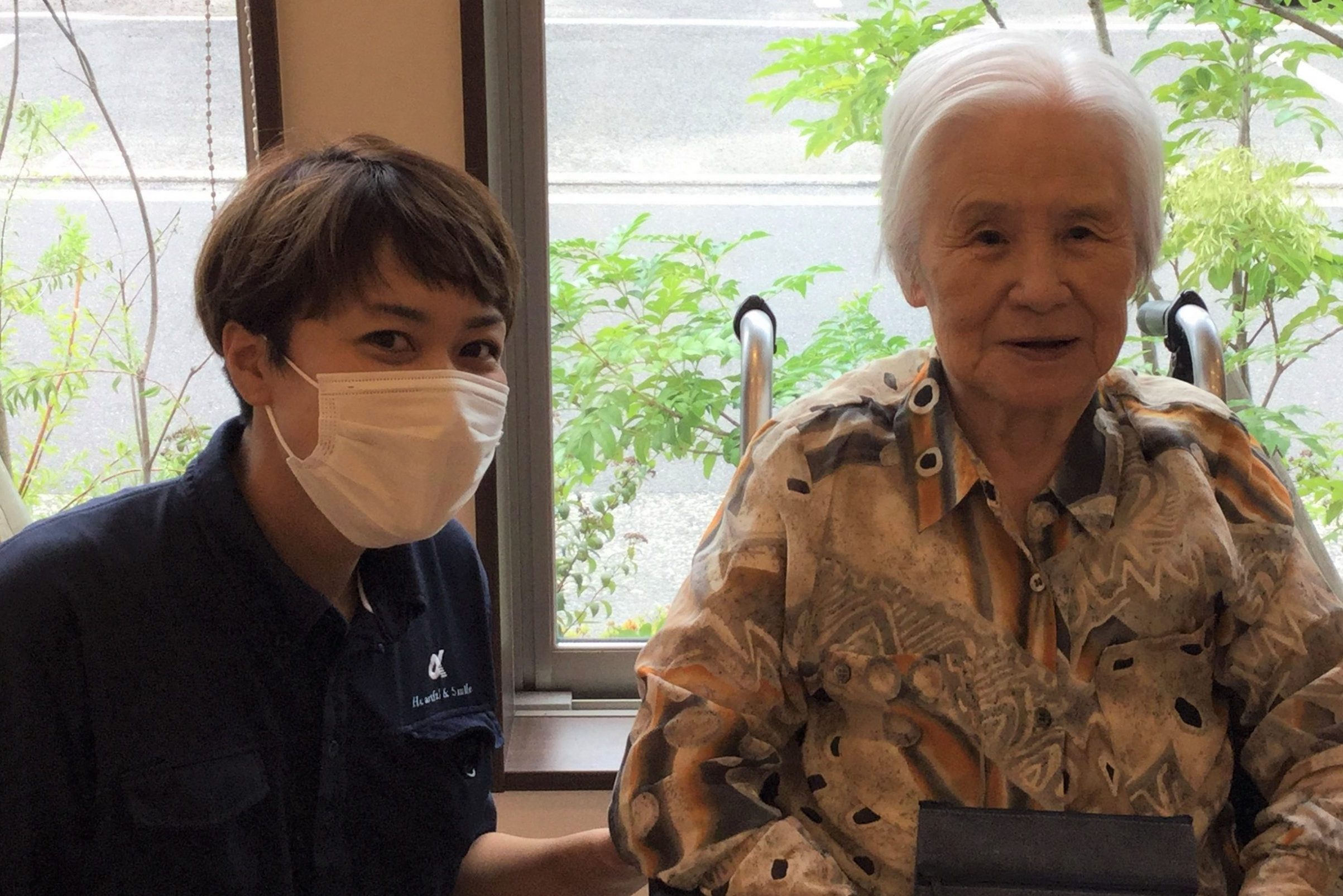 撮影した介護スタッフのきうちさん(写真左)は、Mさまがこのお祝いをきっかけに以前よりお話をすることが増えたことを嬉しく思っています。