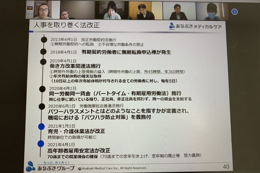 労務管理をする中で、知識として理解しておかなければいけない法律や社内規程に加え、これまで起きた事例や先輩施設長からの体験談や意見も共有しながら、労務の難しさを話しました。