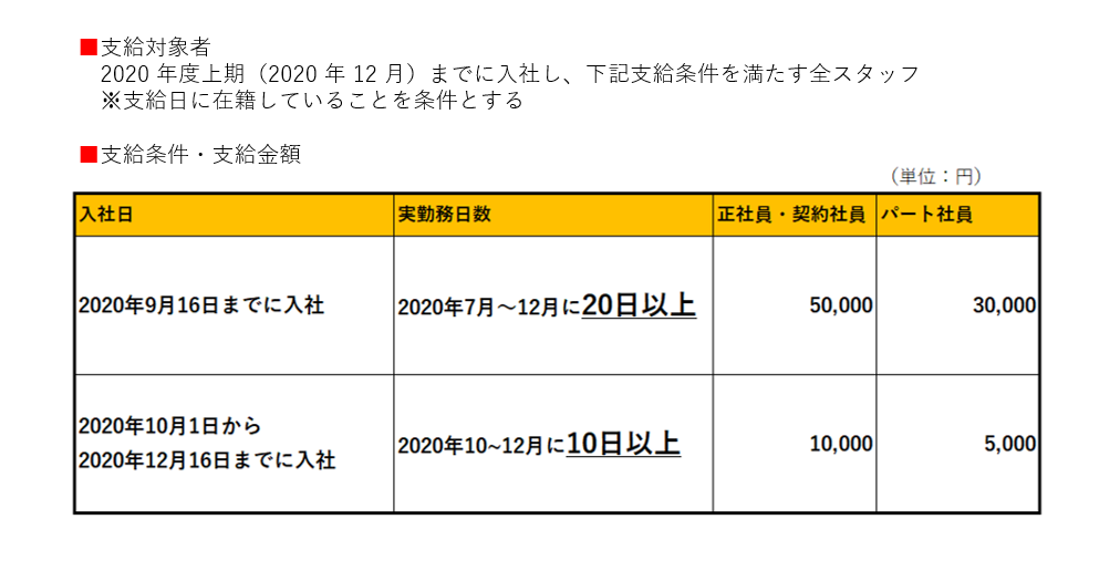 今回の特別感謝金は上半期(2020年7月1日~12月31日)で20日間勤務、10月以降の入社者は10月1日~12月31日までに10日間勤務がある方が支給対象です。
