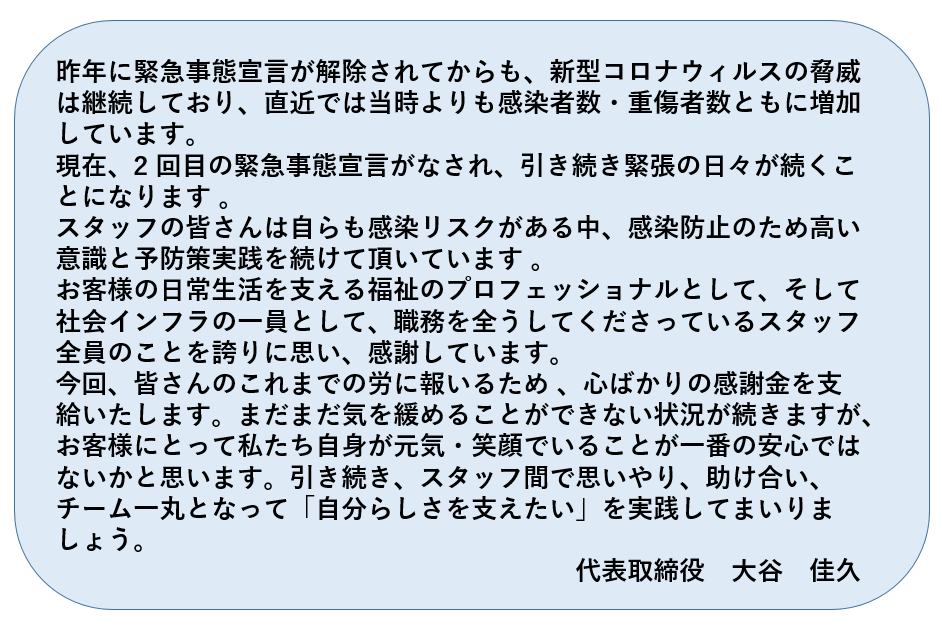 そこで、少しでも安心と元気につながってほしいと願い、心ばかりの特別感謝金を支給することを決定しました。