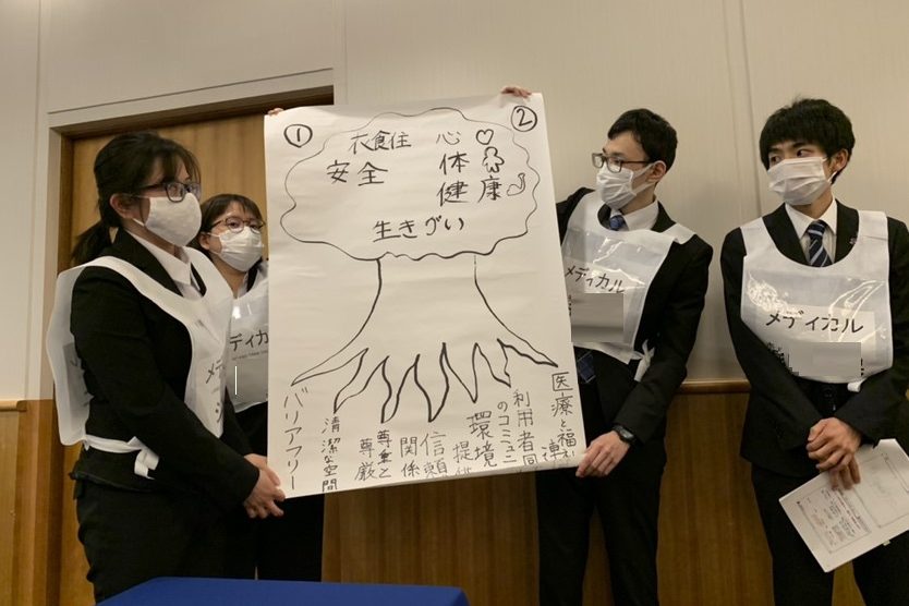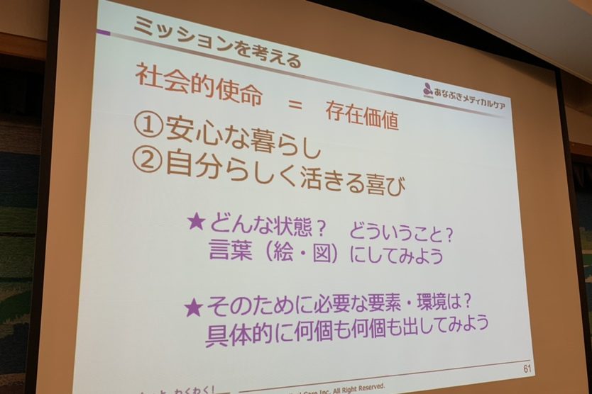 当社のミッション(社会的使命)の中の、安心な暮らし自分らしく活きる喜びについて、グループワークで考えました。
