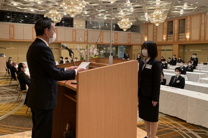 毎年、私が名前の読み上げをさせていただいていますが、毎回この瞬間は新卒社員それぞれとの就活時の出会いや、研修の頑張りなどが脳裏を思い浮かび、色々な想いがこみ上げてきます。