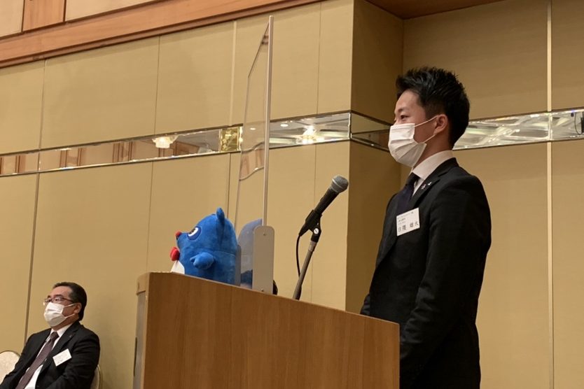 当社の新入社員代表として、アルファリビング岡山野田のあおやまさんが壇上に上がり、おおたに社長から辞令を受け取りました。