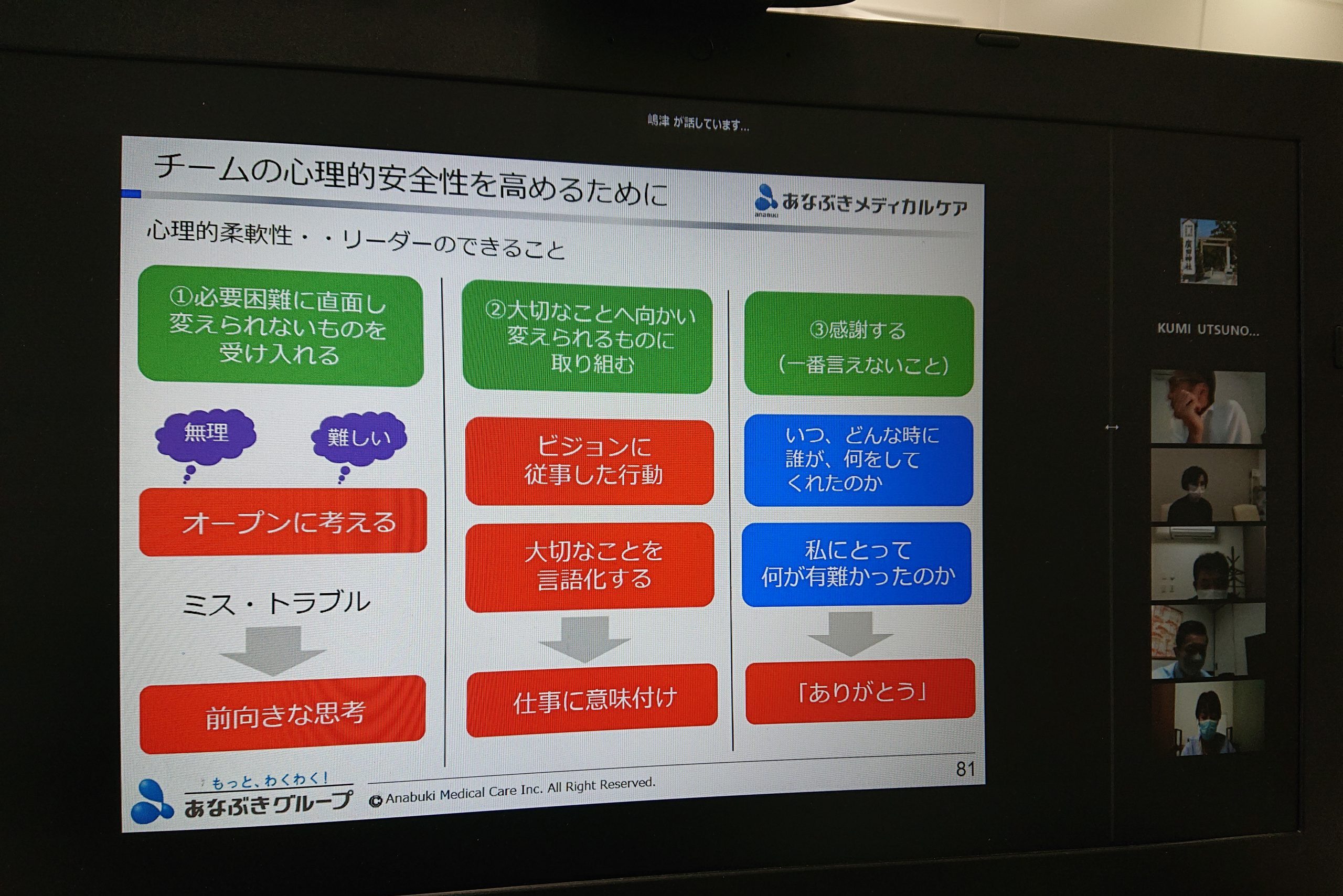 社員が気兼ねなく自分の考えや想いを話すことができ、自分らしくいられるチーム作りについて考えを深めました。