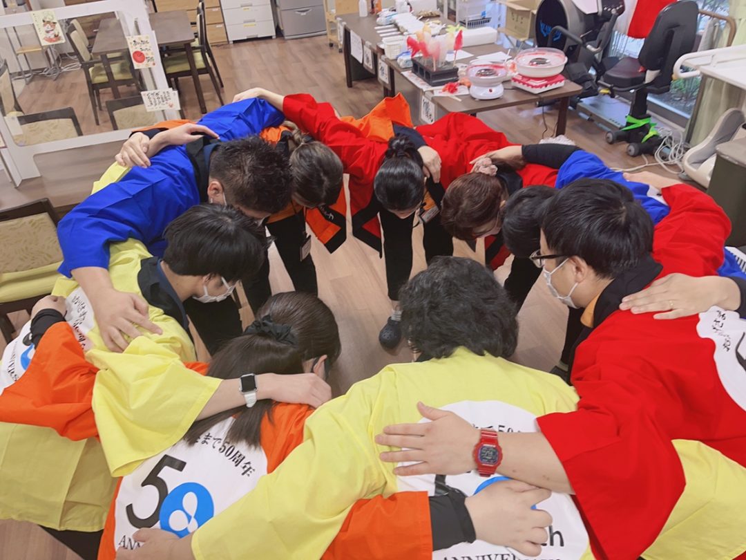 皆さんを迎え入れる前にスタッフで円陣を組んで最終の気合入れ!