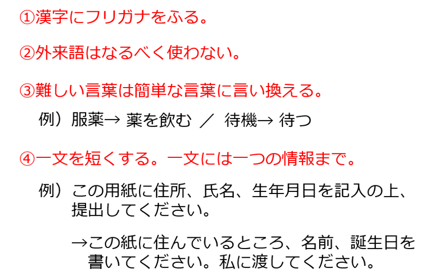 相手を思いやり、いかに簡単な日本語で必要最低限の情報を伝えるか、ということが大切です。
