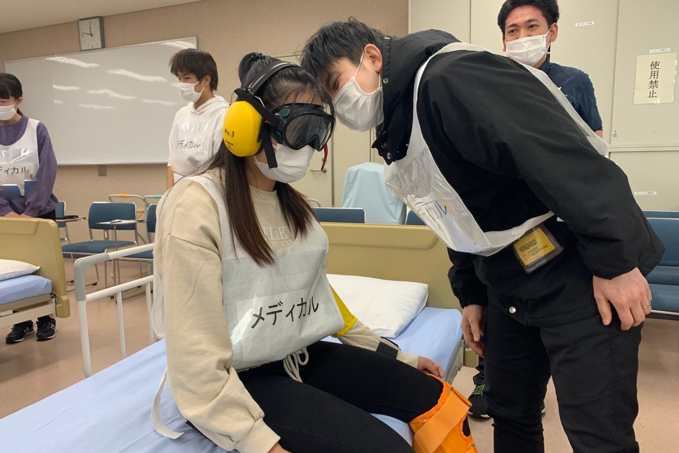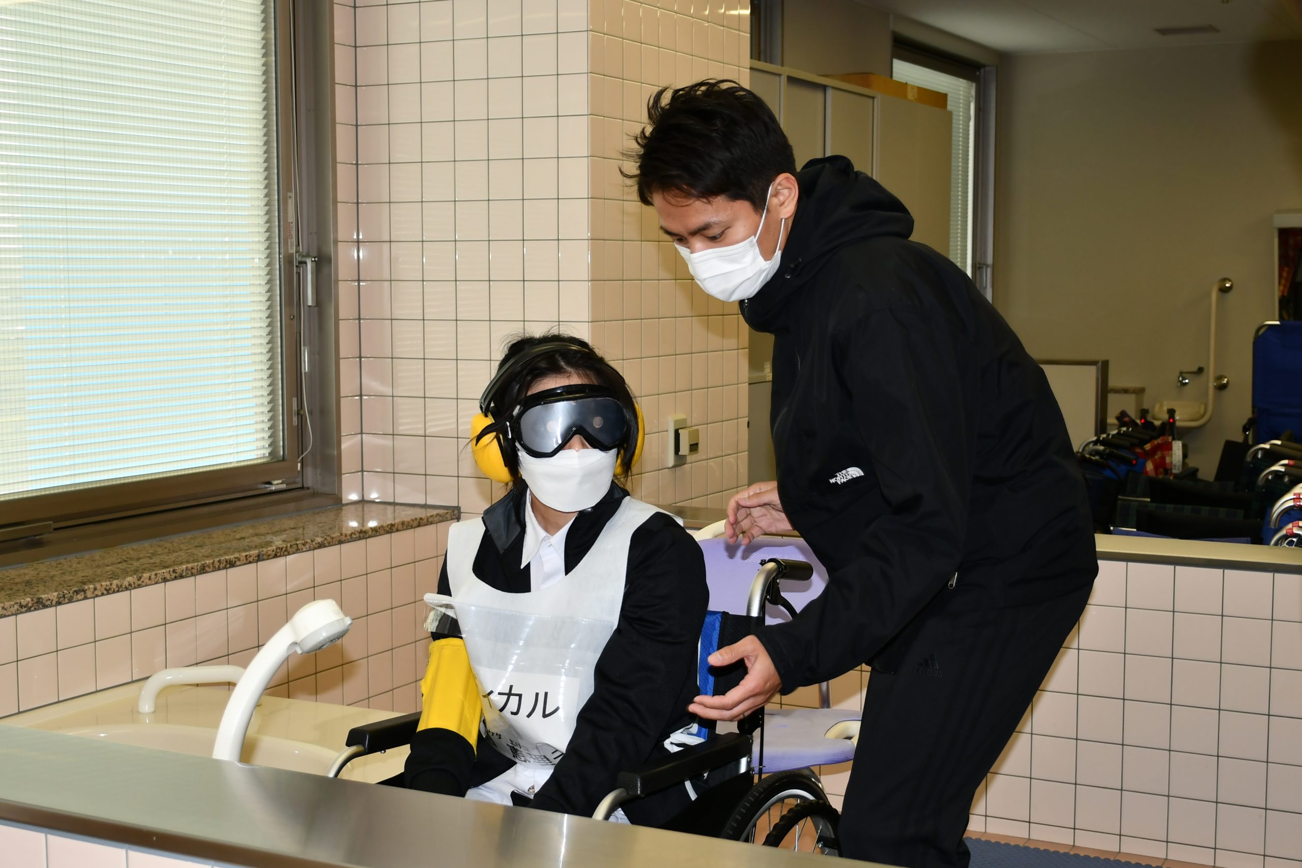 高齢者の疑似体験では、目や耳、足が不自由なご入居者のお体の状態を体験し、どんな気持ちでいるかを考えました。
