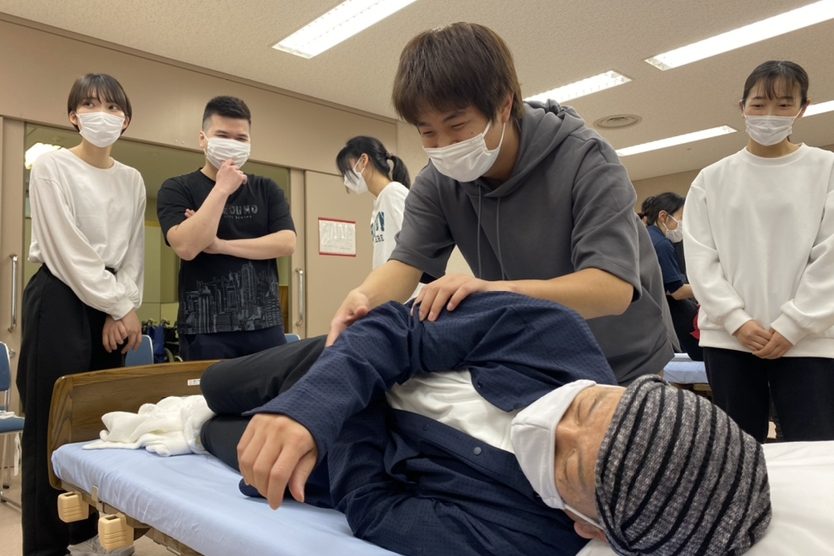 着脱や移乗介助の基本的な流れについて、スタッフ役とご入居者役を交互に行い、双方の気持ちを”体感”しました。