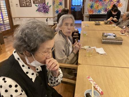 喫茶の時間にお祝いの巻寿司をお出しし、一緒に祝い。