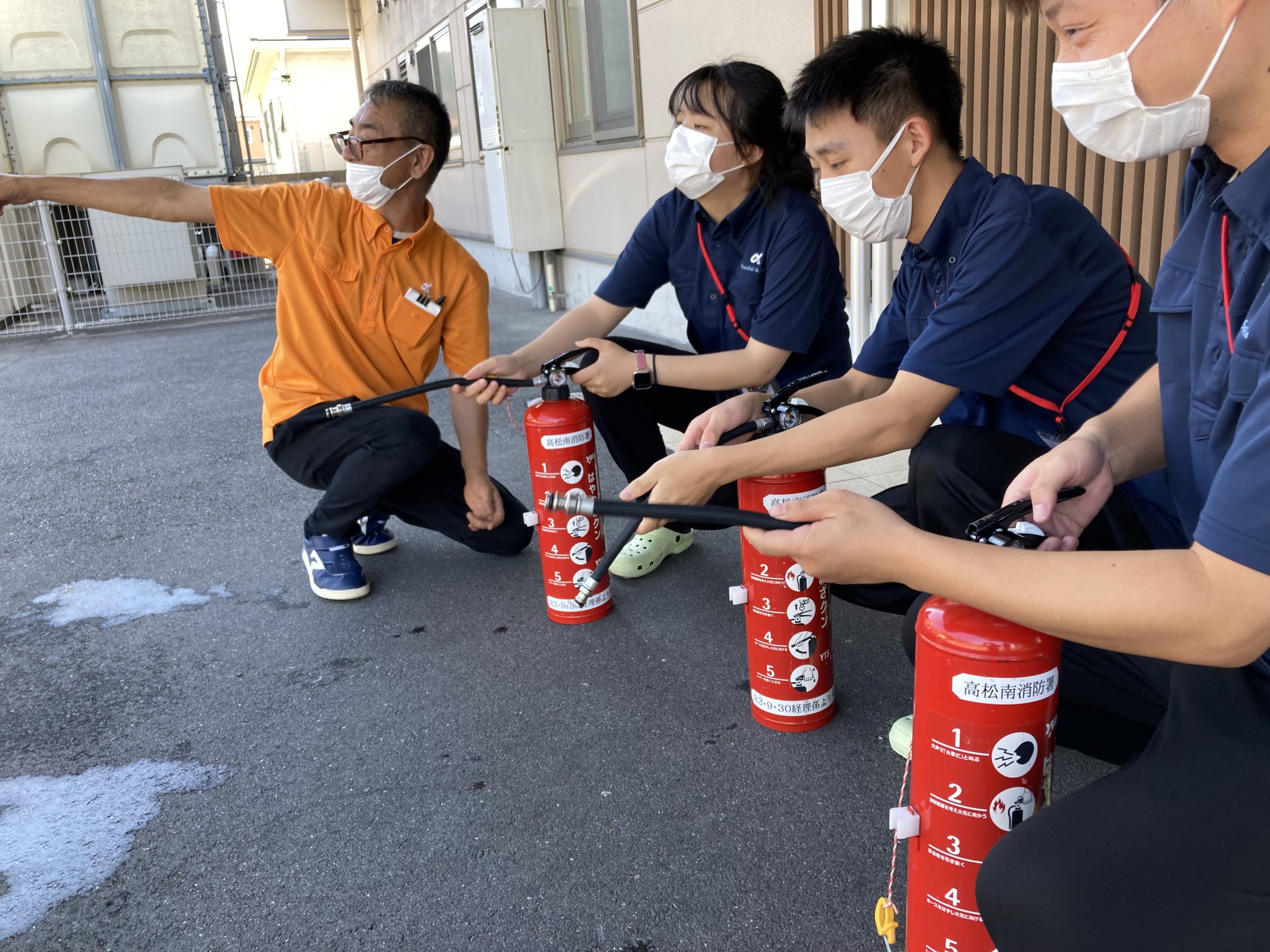 消火訓練も消火器は知っているけれど、使用するのは初めて!とのこと。防火管理者のこやまさん指導のもと、安全に的確に消火訓練も行えました。
