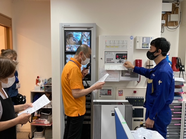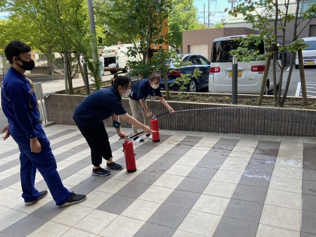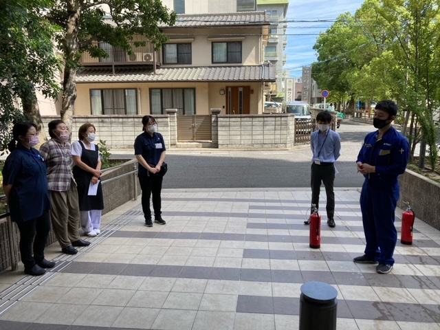 火災発生の館内放送や消防署への通報、そしてご入居者のおひとりにもご参加いただいて、避難誘導、消火器の使い方までしっかりと学びました。