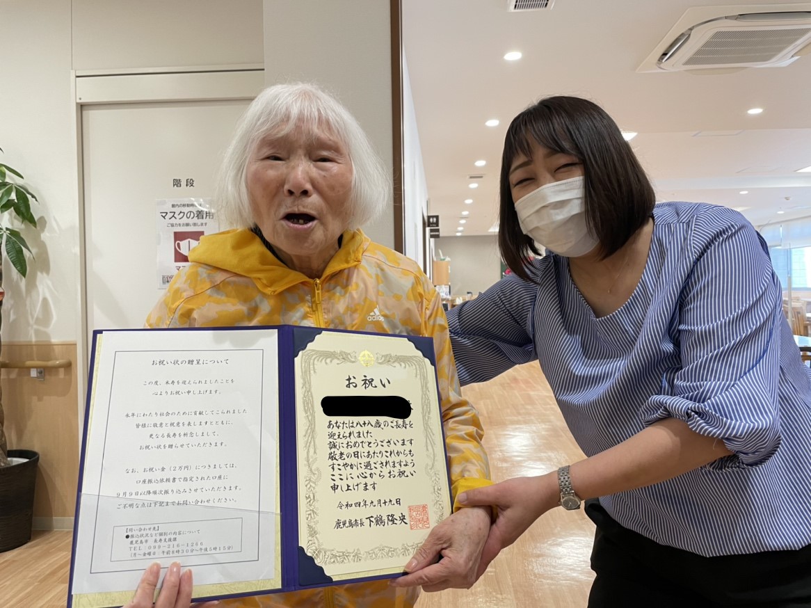 コロナ以前は、鹿児島市から職員の方が来てくださり、88歳を迎えられる方に、賞状を贈呈していましたが、感染症拡大防止のため、現在はホームで代行させていただいています。 先日、鹿児島市から賞状が届きましたので、施設長から贈呈いたしました。