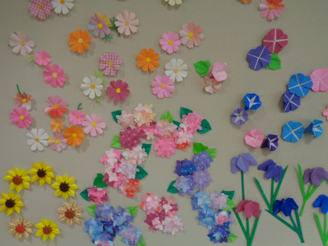 エレベーターを降りてすぐの壁面に、折り紙の作品をかざっています。手先が器用なスタッフを中心に作りました。