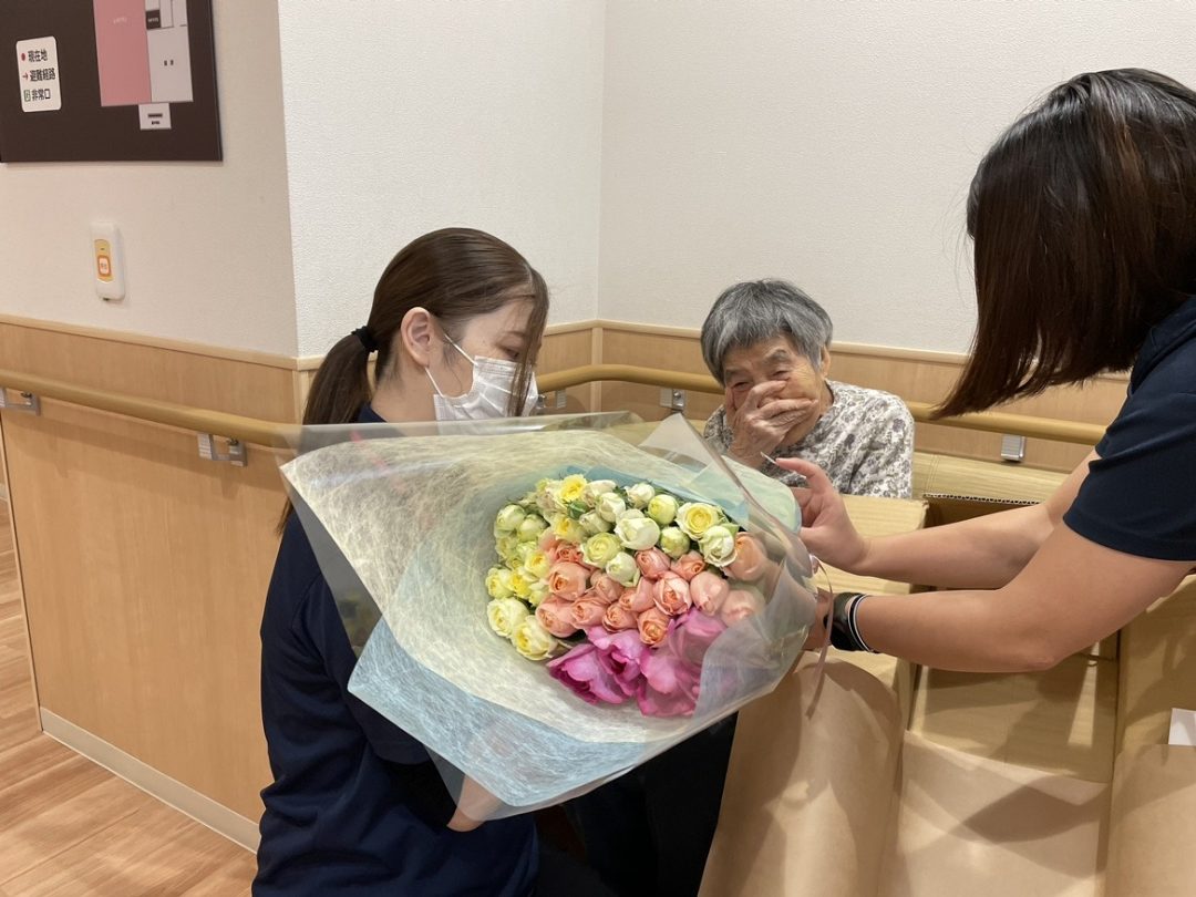 お誕生日当日はご家族がお花とプレゼントを持って駆けつけてくださったり、お孫さん一同からの花束が届いたり、感激・感動の連続で涙を流す場面もありました。