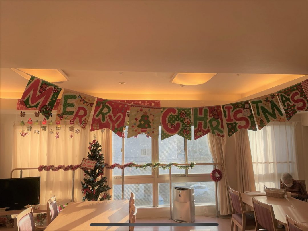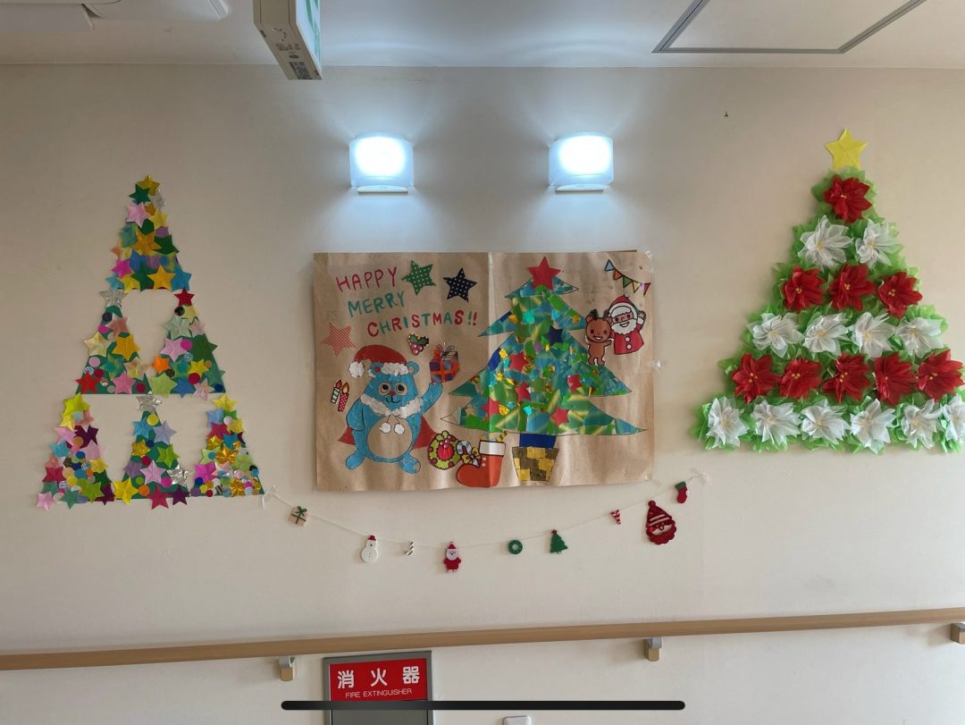 左側に写っているツリーはご入居者に作成していただいた小さなツリーの貼り絵を組み合わせて大きなツリーにしました!