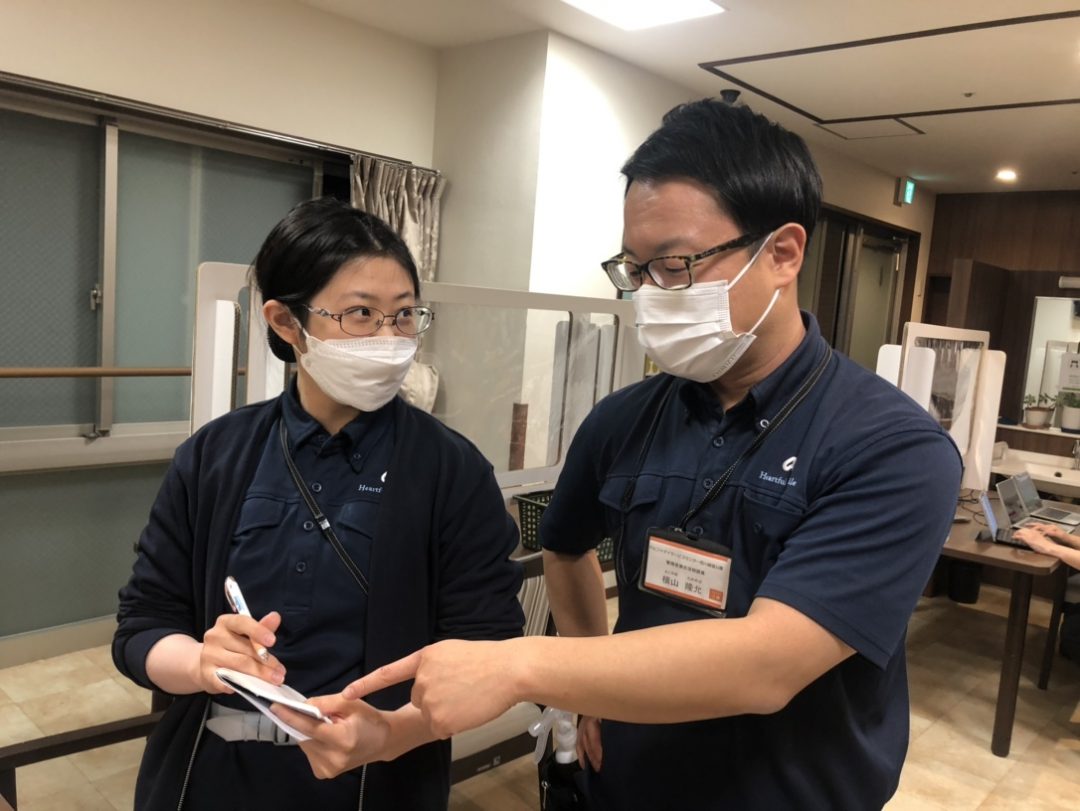 明るくて少しおっとりしたたけださんはご入居者からもよく声を掛けてもらっています。その声に一生懸命お応えしようとしている姿を見て、自分自身が入社当初の頃を思いだし、良き先輩として手助けをしていこうと指導にも熱がはいります。