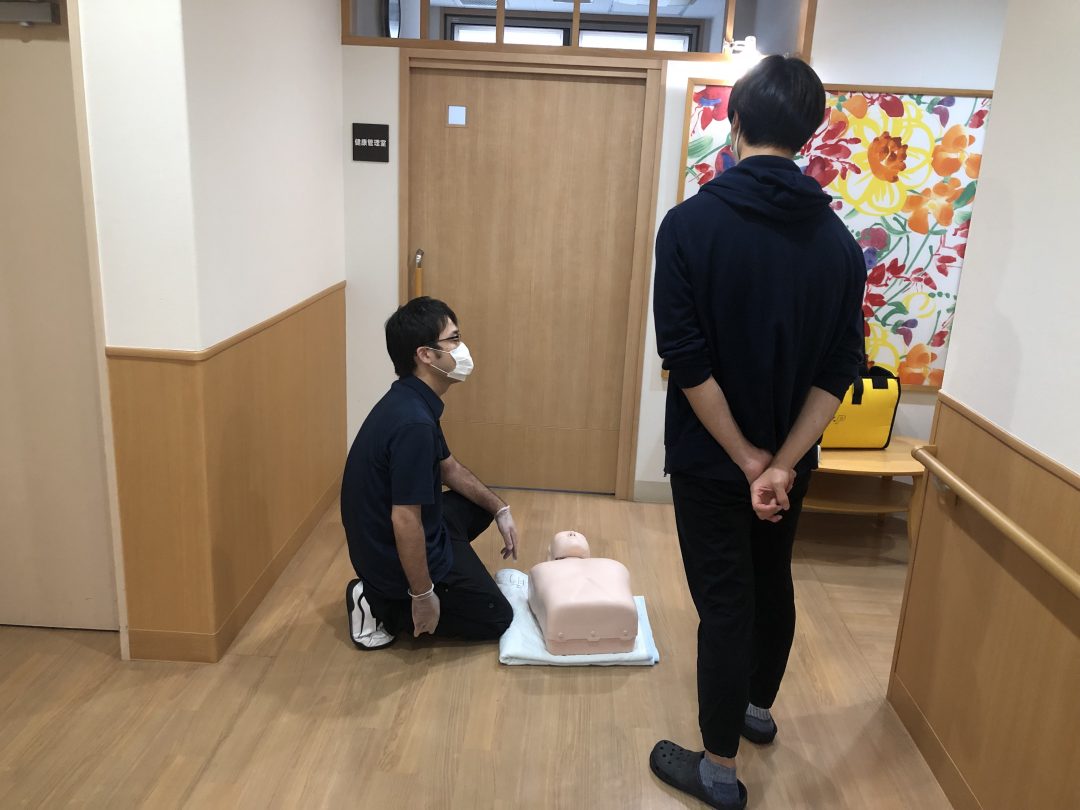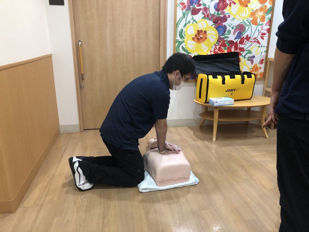 実際にシミュレーションしたり、人形を使って心肺蘇生の練習をしたり…。