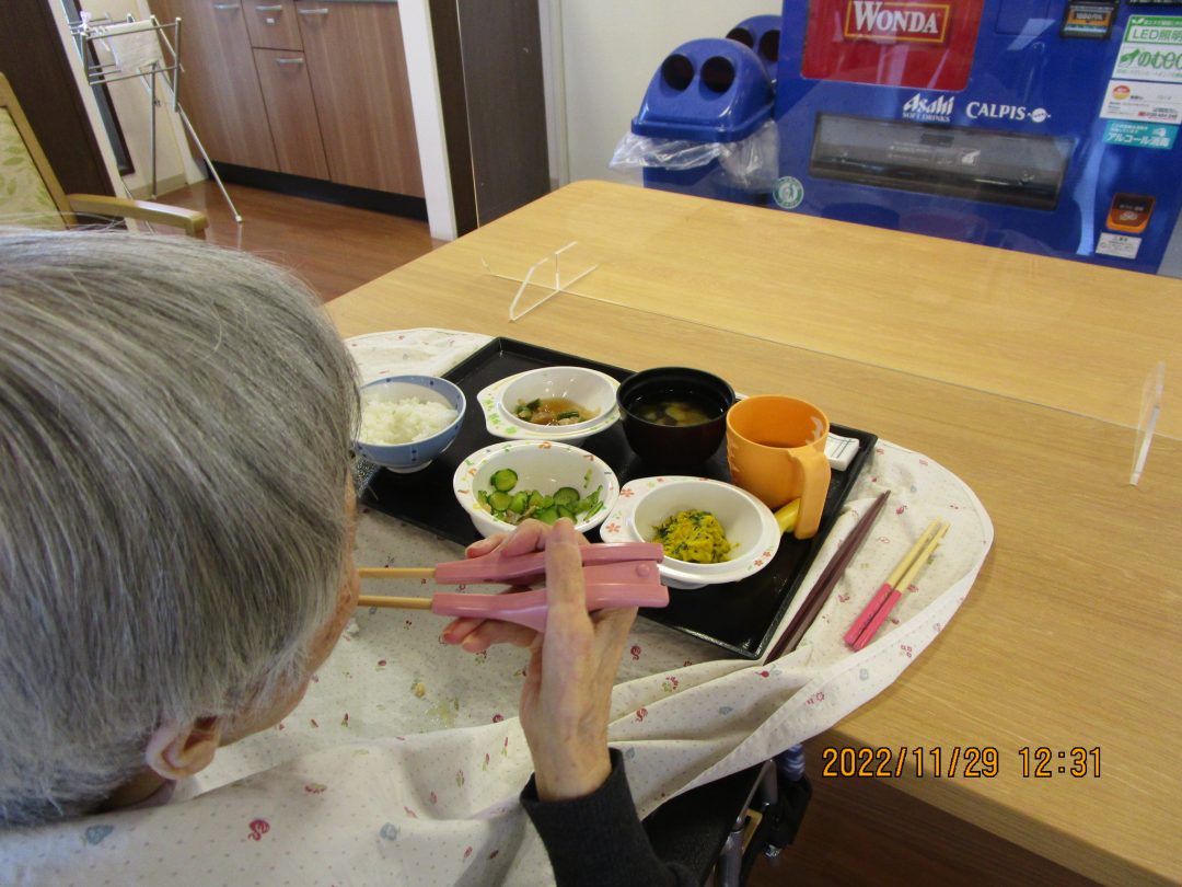 フロア担当のほかスタッフとも話し合い、少ない指の力でも使用できそうな福社用具のお箸を試行してみることになりました。