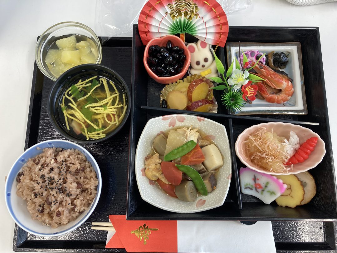 昼食のメニューはおせちと甘酒。