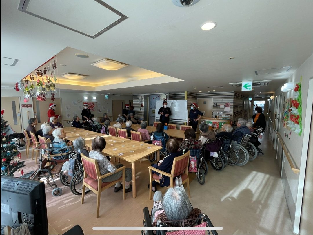 当ホームでは、ご入居者の皆さまに、日頃の感謝の気持ちを込めてクリスマス会を開催しています。無事でよい1年をお過ごしいただいたことに感謝し、1年間の振り返りもかねて行っています。