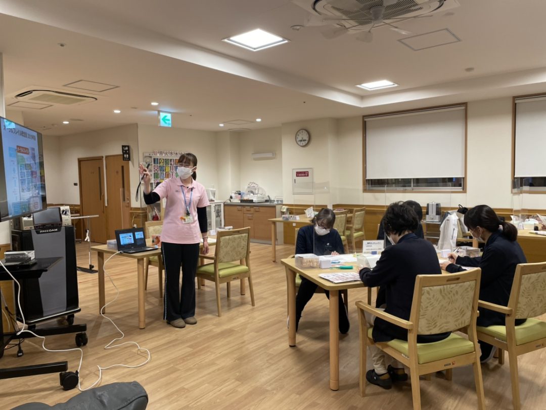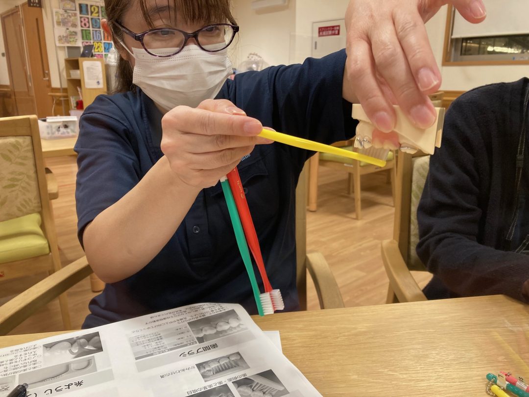 スタッフも口腔ケアについてもっと知りたいという気持ちもあり、今回は「岡山市ふれあい介護予防センター南事務所」の歯科衛生士さんをお迎えし、口腔のアドバイスをしていただきました。