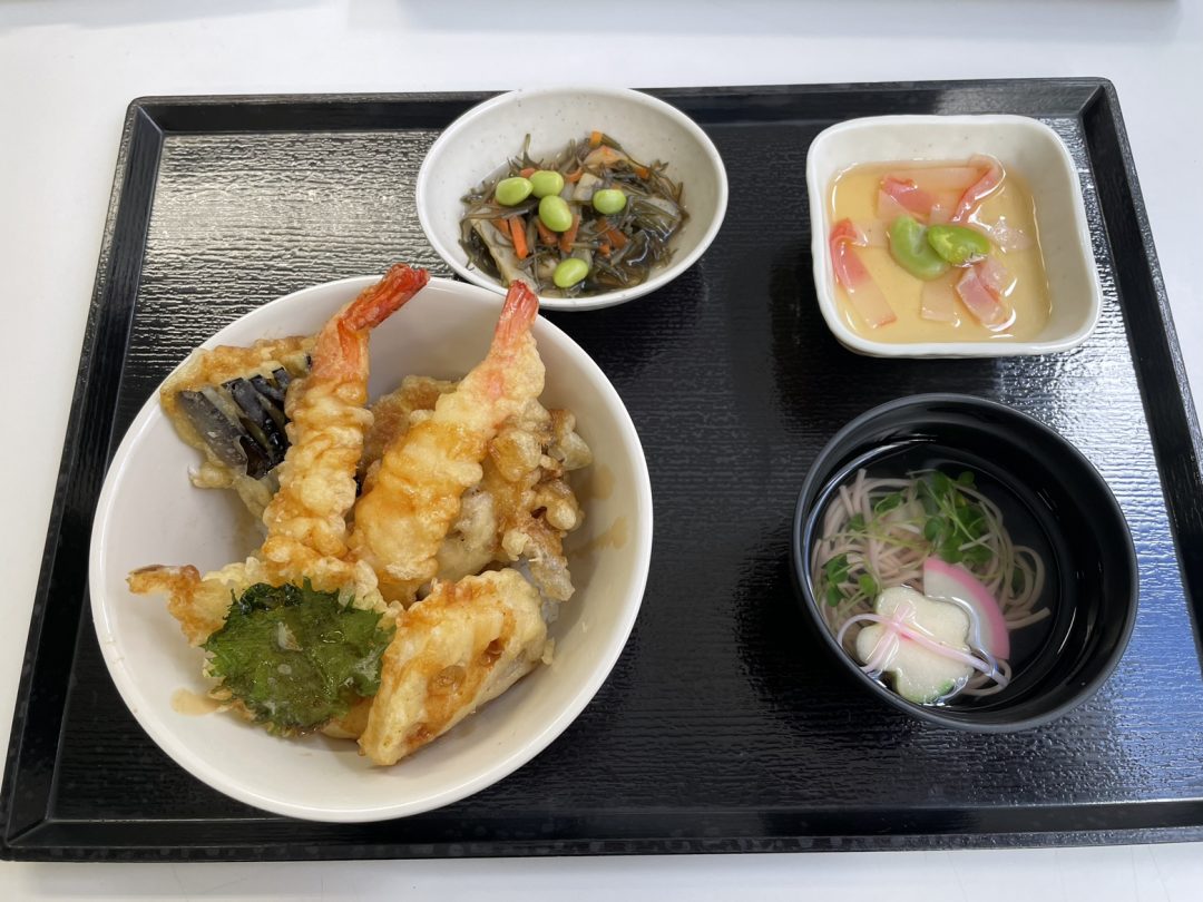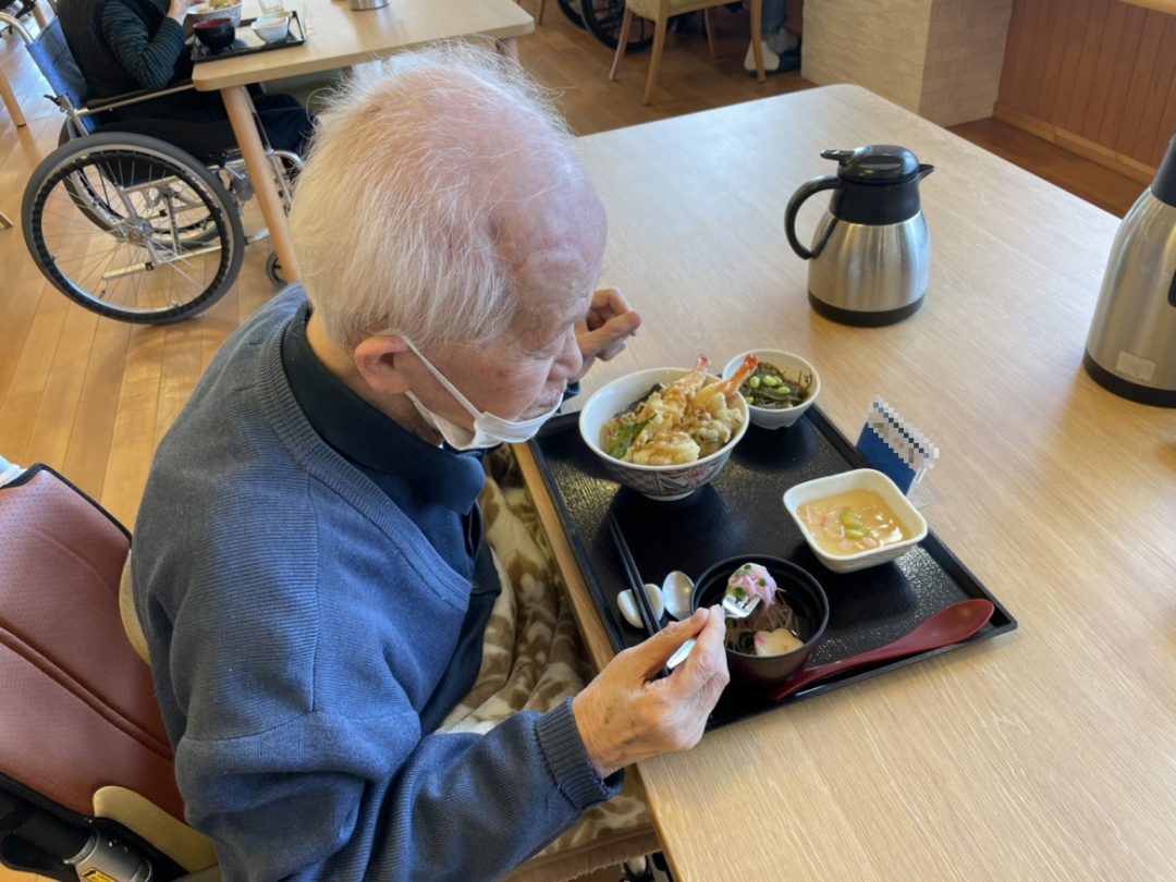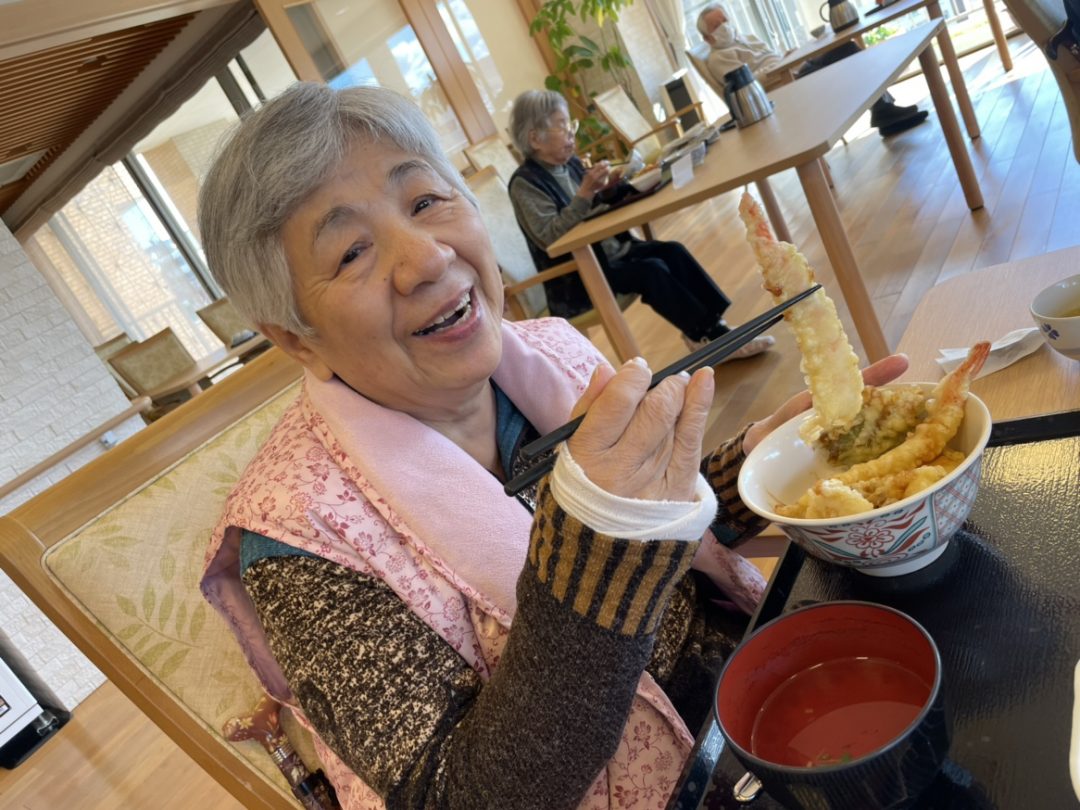 今回のメニューは“大海老天丼”です。「楽しみね」と口々にレストランへ向かわれるご入居者も、対応するスタッフもワクワク(‘ω’)!