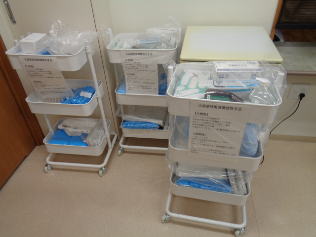 また、感染症発症時の時に備え感染キットをカートにまとめ常備し定期的に在庫チェック、補充しています。(これが活躍しないのを祈っています)