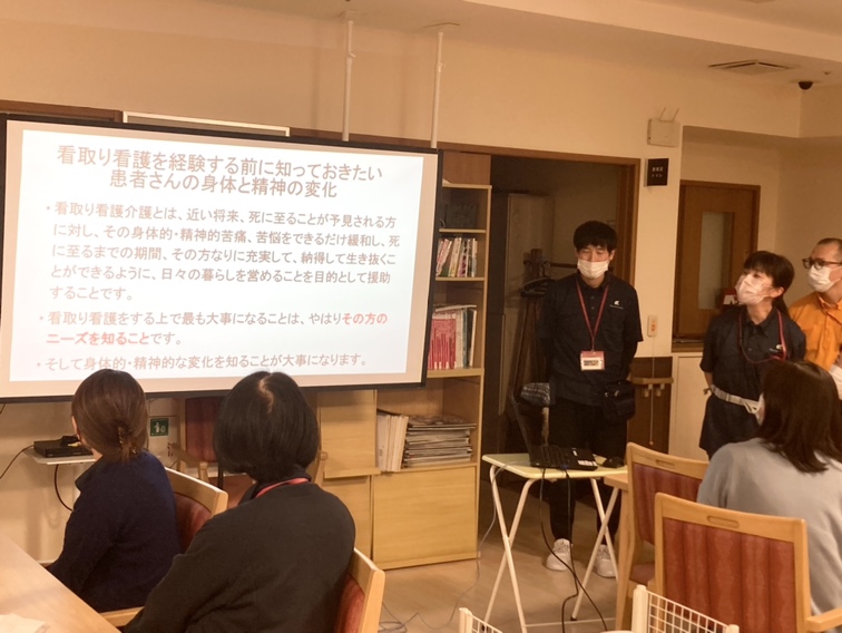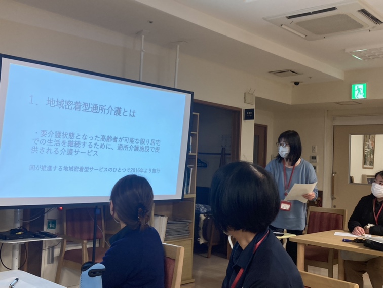 スタッフ研修の「地域密着デイサービスとは」「アルファリビングでできる看取りケア」を行いました。