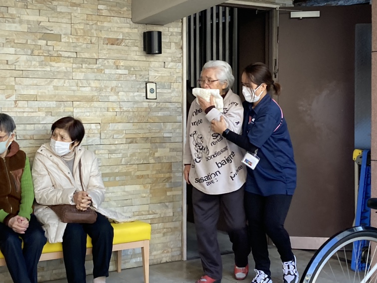 ご入居者の皆さんは、居室から階段を使って1階へ移動していただきました。