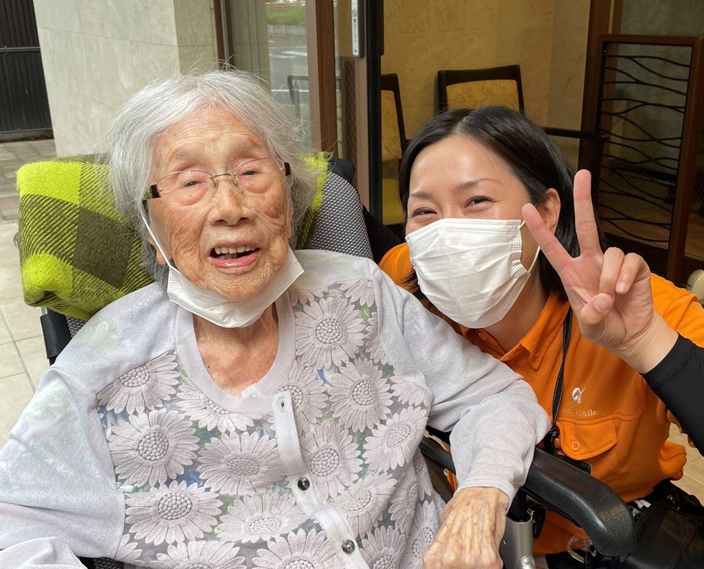 さかもとさんはデイサービスで1番の元気印。さかもとさんがいるデイルームはいつも賑わっています。