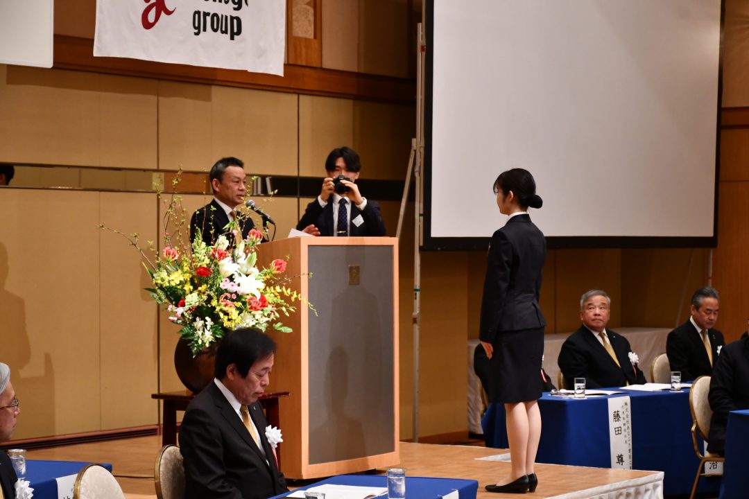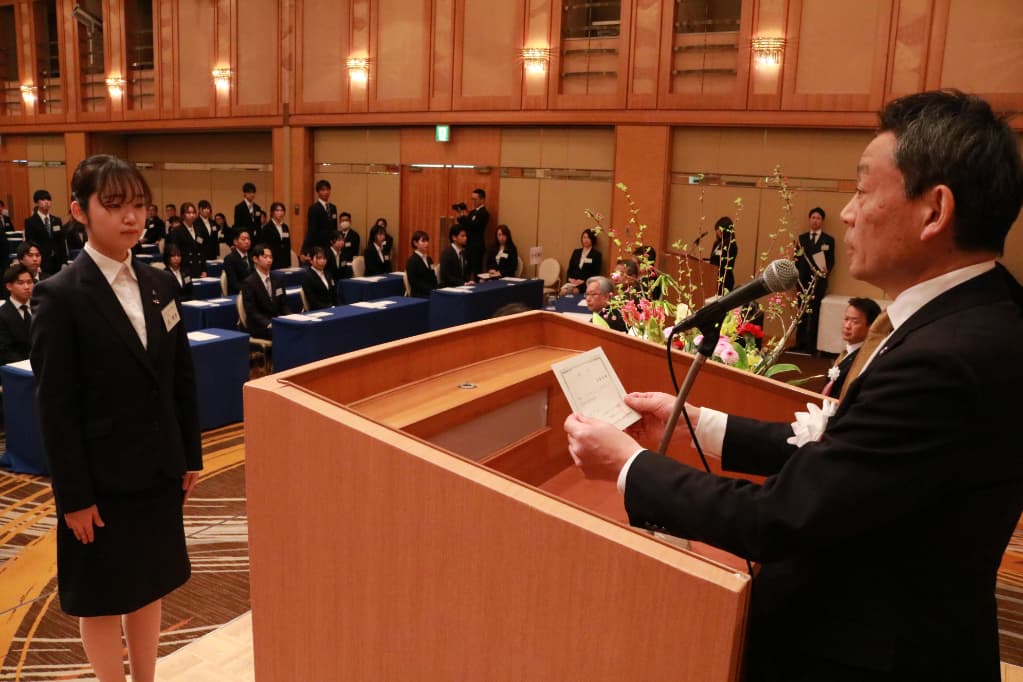 あなぶきグループの入社式は、一人一人名前を読み上げ辞令交付を行います。