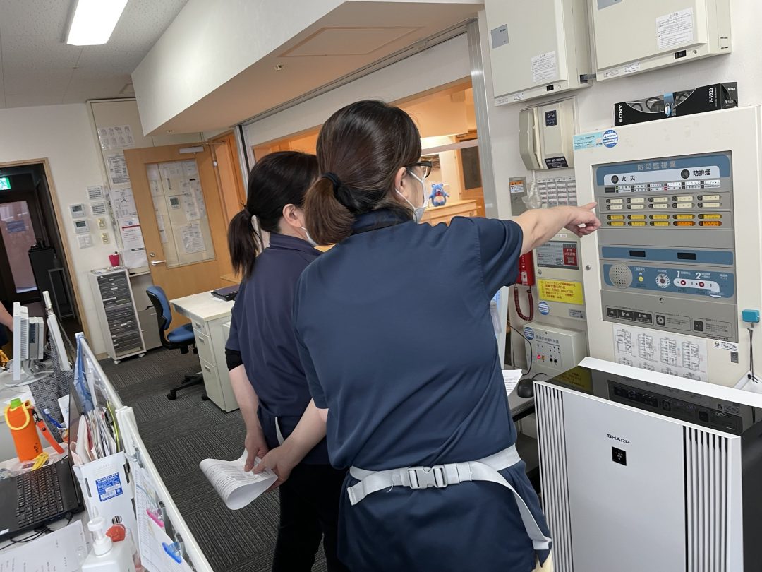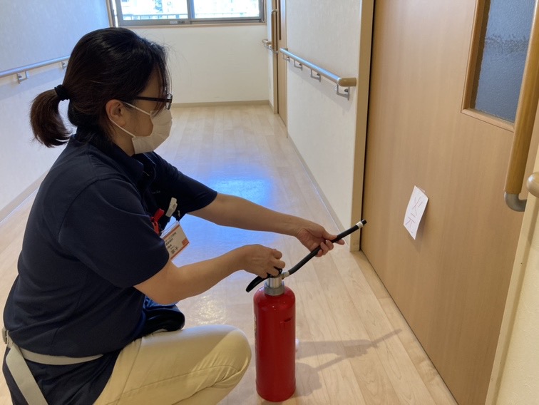 火災報知器作動後、火災の場所の特定や初期消火、通報・ご入居者の誘導のデモンストレーションをし、実際の災害に備えた行動確認をします。