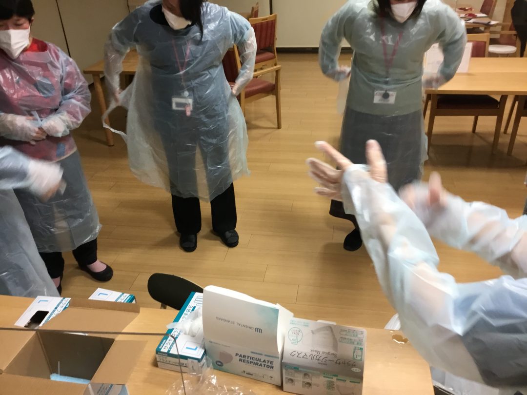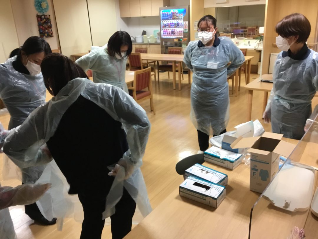ただ、私たちの勤務している高齢者住宅では、今後もマスクの着用や基本的な感染対策は続けていきます。発生時は、感染を広げないための対策が必要であり、今回の研修では感染対策用のガウン等の試着を再度研修しました。