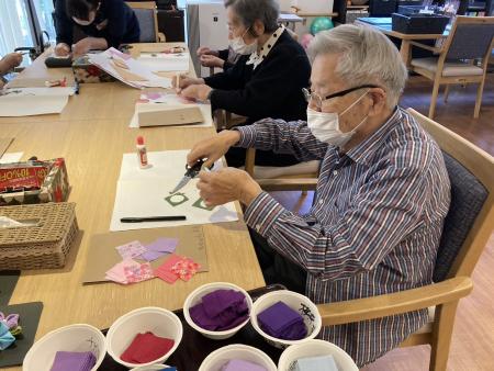 ちりめんの色も、お好みに合わせてお選びいただけるよう、ご利用者のお声を聴きながら選び、一緒に切り分け準備もします。
