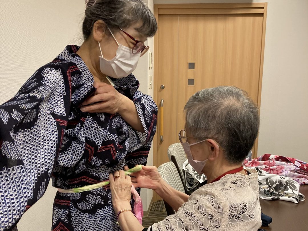 七夕当日、浴衣を持っているスタッフが持ち寄りFさんと事務スタッフのながおさんが着付けを担当してくれました。