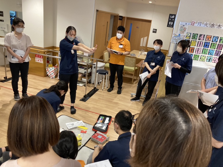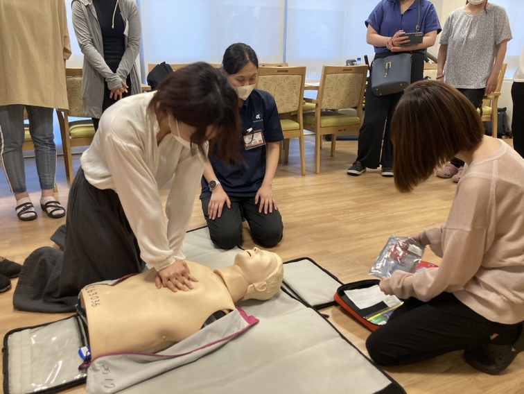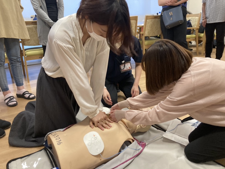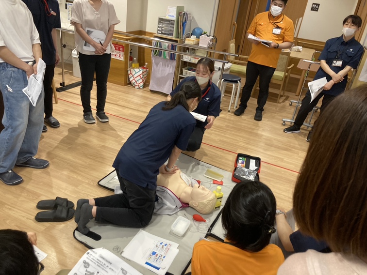 今回のエリア研修は、「AEDの使い方と心肺蘇生の方法について」でした。人形を使いながら看護スタッフの指導のもと実施しました。