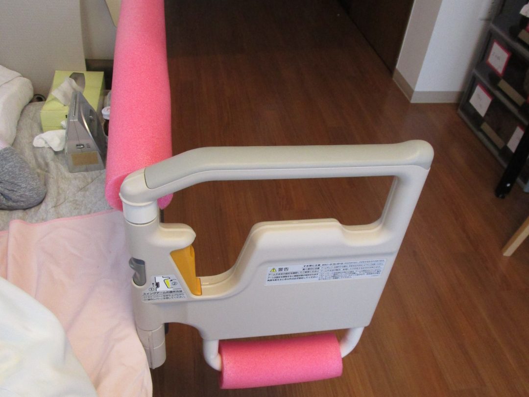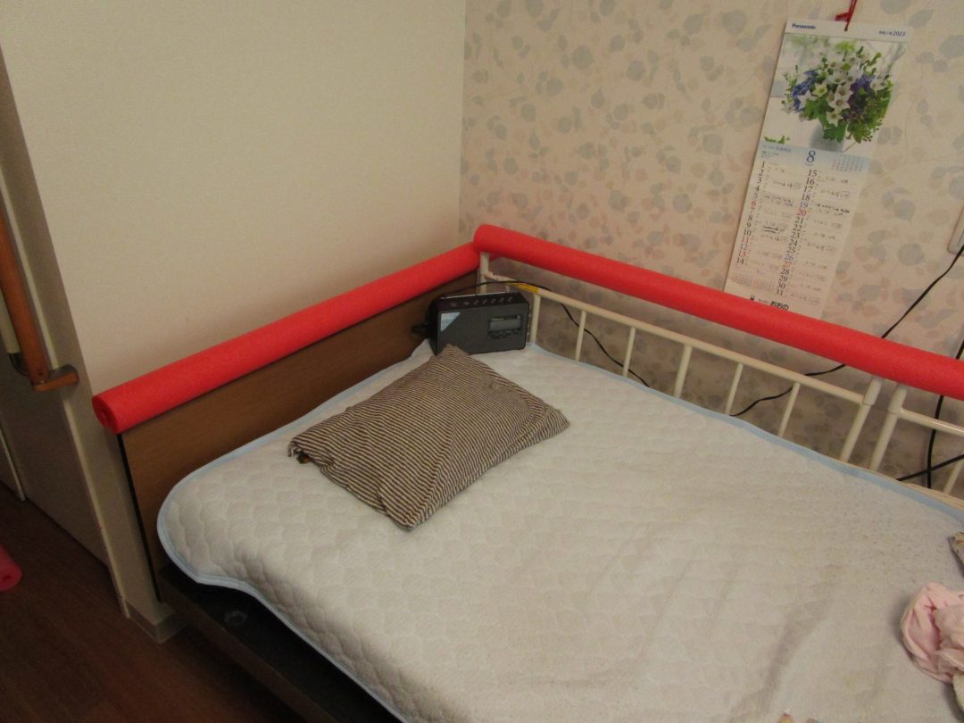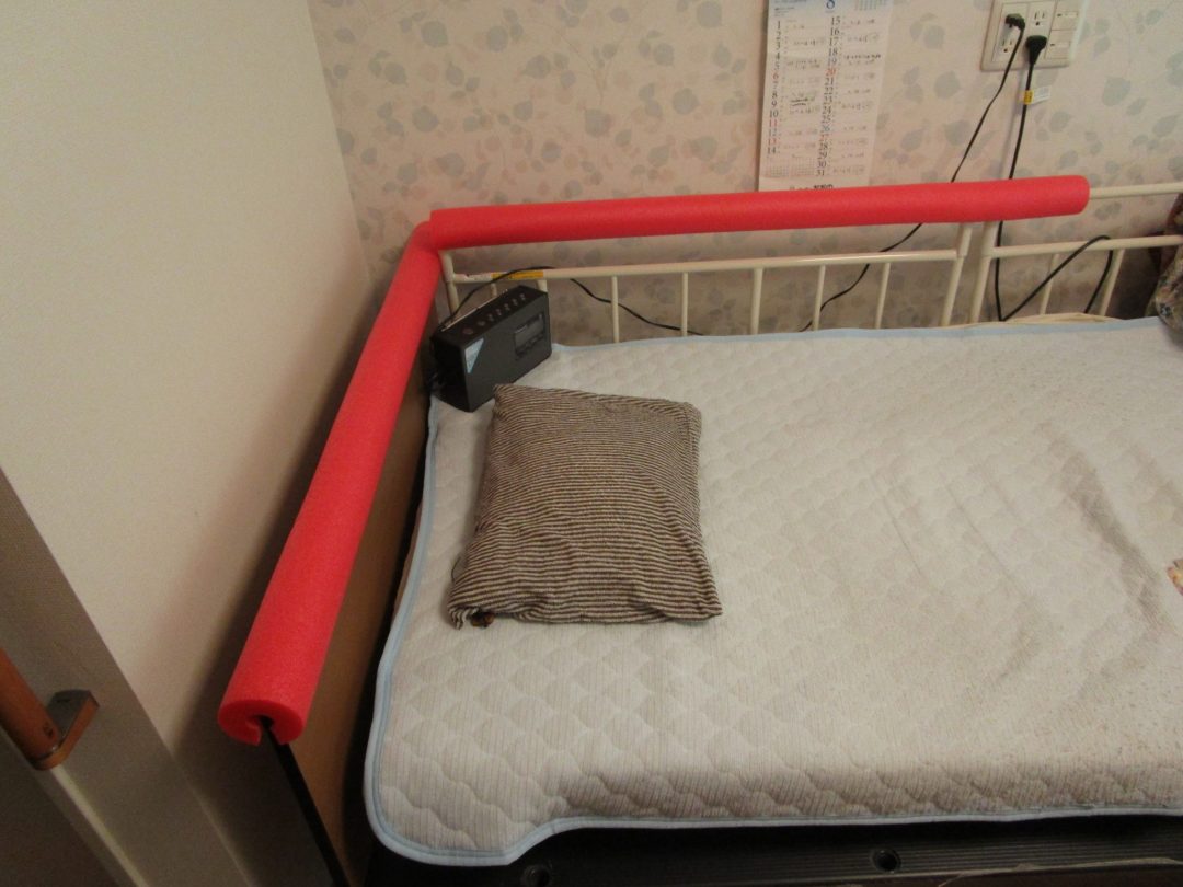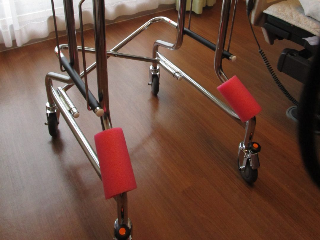 他のご入居者にも利用できそうなので、長さを合わせて切り、ベッド柵や歩行器の足元にも取り付けてみました。これで内出血が少しでも減るといいなと思います。