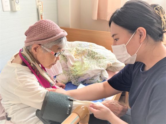 人柄の良さといえば、先日Kさまの入浴介助に同行させていただいた時も、浴室の準備から丁寧で、着替えの準備やバイタルチェックもKさまのご意向やご様子、状態を伺いながらひとつひとつを丁寧にされていました。