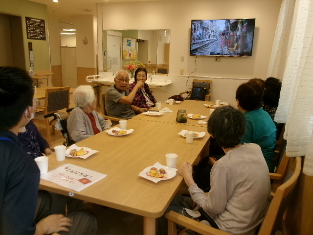 当日はご入居者とベトナムのお菓子・飲み物をいただきながら、簡単な挨拶を教えてもらいYouTubeでベトナムの歴史や文化・風景を楽しみました。