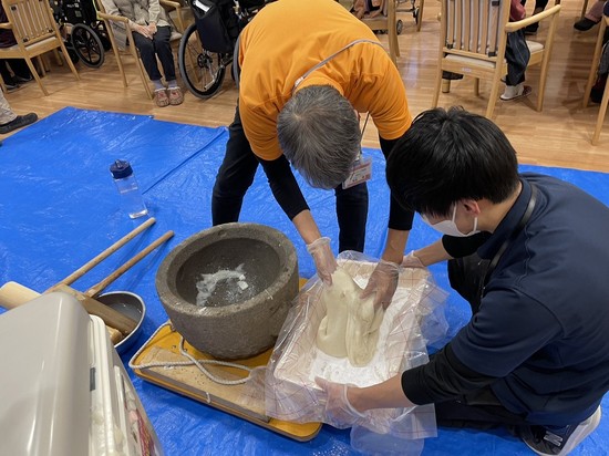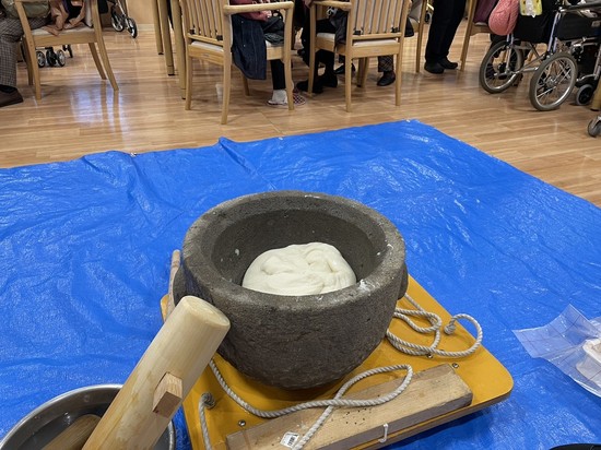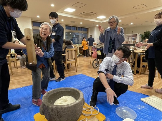 餅つきとはもともと、神様へのお供え物だったお餅を、お祝いごとや祭りなど人が集まる行事の時にみんなでついたのが由来で、そのお餅を食べることでみなさんの幸せを願う意味があるのだそうです。