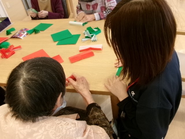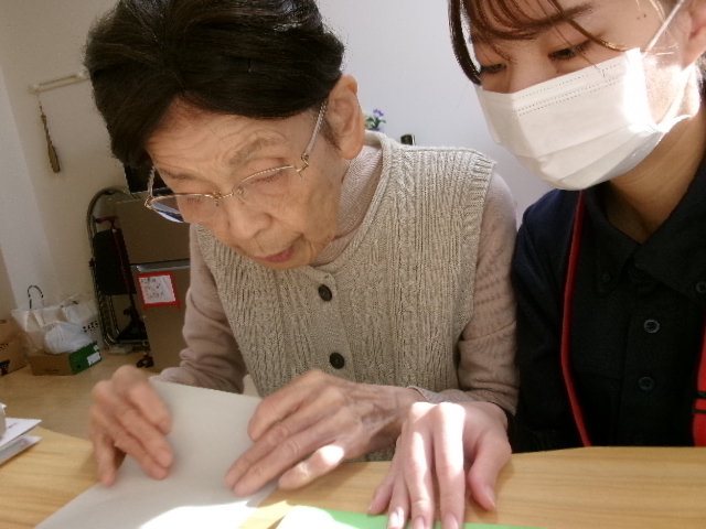 介護度が高い方の移乗などは他スタッフの方々に手伝ってもらいながら、業務を行いました。足を怪我していたので、少ない動きでご入居者と一緒にできることは何かないかと考え、レクリエーションの時間にレストランのホワイトボードに飾る季節の折り紙を一緒にすることにしました。