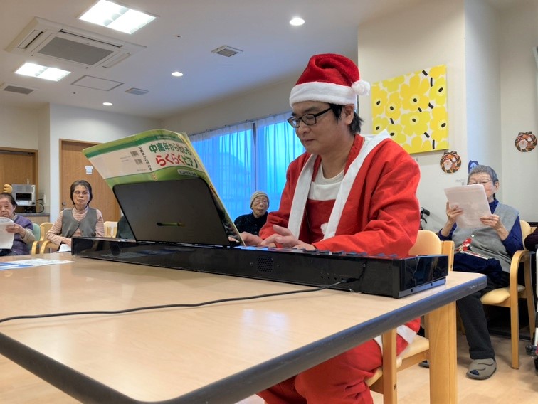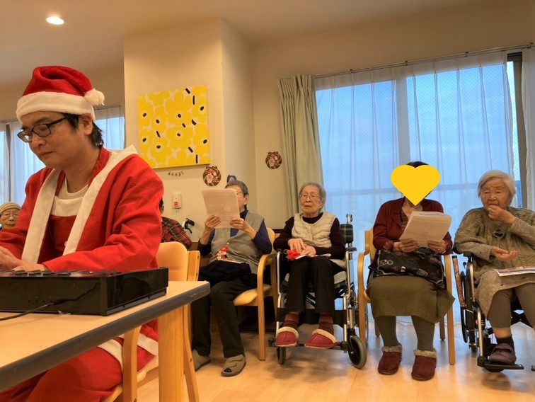 ご入居者の前で、演奏。曲はもちろん「ジングルベル」