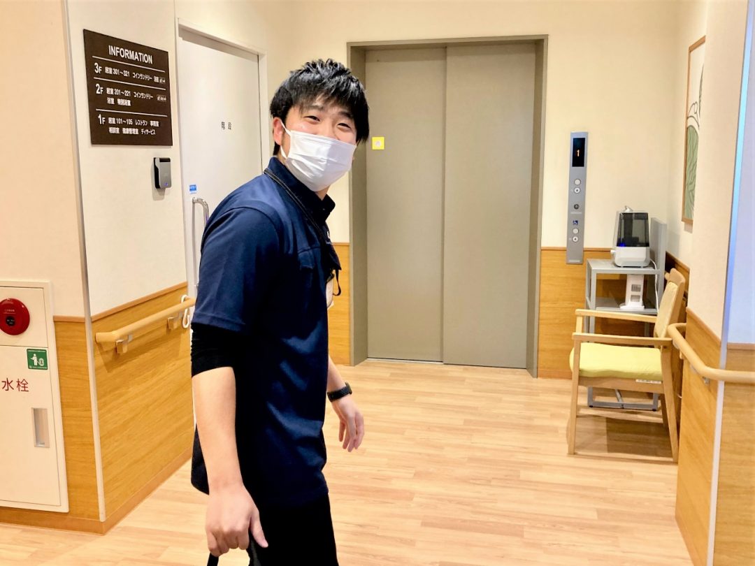 1月からは独り立ちし、アルファリビング岡山野田の他に岡山市内の3拠点で専門的なリハビリを行っています。入社されてまだ2か月足らずですが、とても素直で明るい好青年といった印象のまつもとさんは、すでに覚えてくださっているご利用者がいたり、見かけると声をかけてくださるご利用者がいたりとご利用者からの人気も上々です。