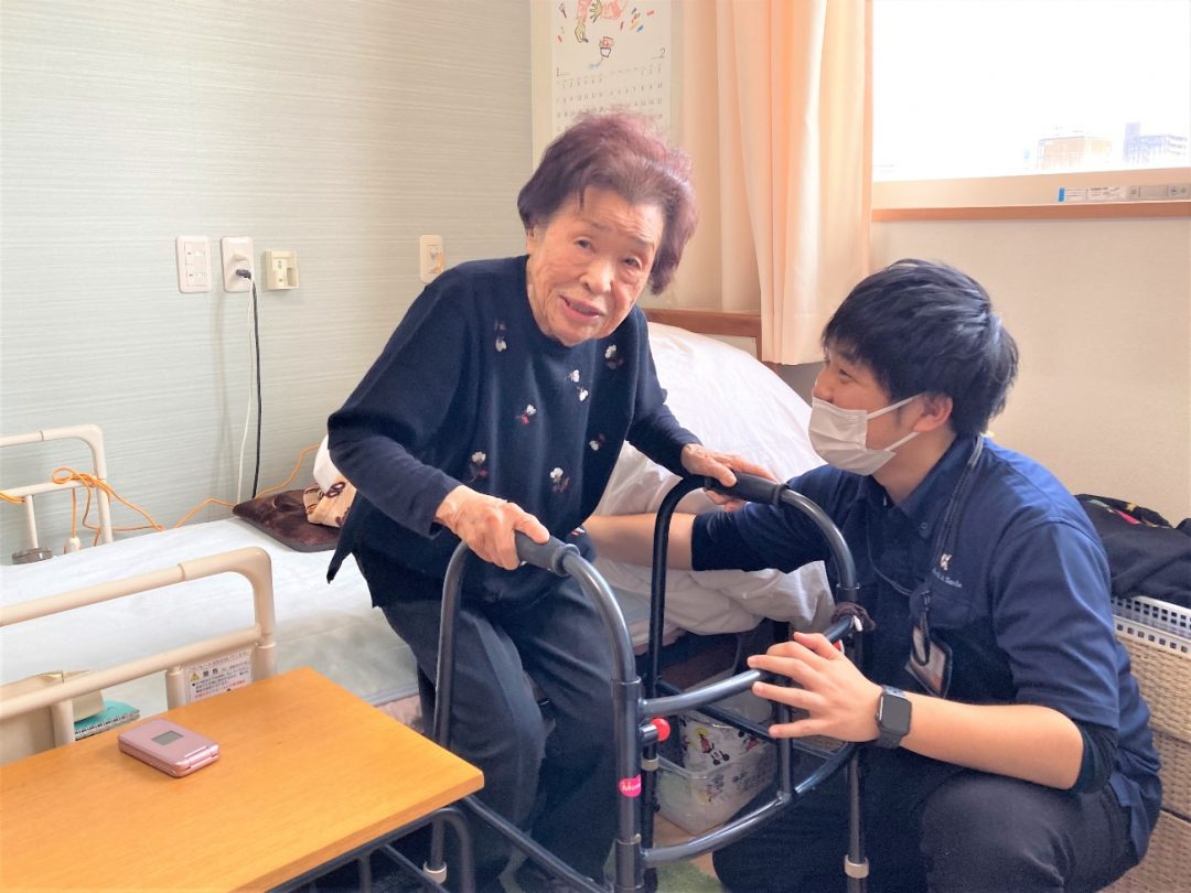 Hさまのリハビリの様子を覗かせていただくと、楽しそうな雰囲気の中、ベッドからの立ち上がりの練習をされていました。1回、2回とゆっくり立ち上がられ、座るという動作を繰り返します。以前のようにスムーズに立ち上がりができないとおっしゃるHさまに、ポイントをアドバイス。最近、少し自信をなくされているように思っていましたが、まつもとさんの明るさと優しい声掛けで、次はポイントを意識ながらもう一度。先程よりスムーズにできるようになりました。続けることが大切ですので、これからも一緒に頑張ってください。